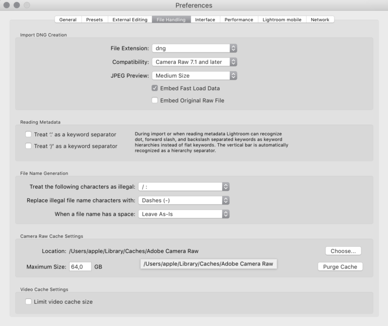 Lightroom používá cache pro dva typy souborů – pro zpracovávání RAW snímků a pro práci s video soubory. obojí je náročné jak na výpočty, tak na místo.