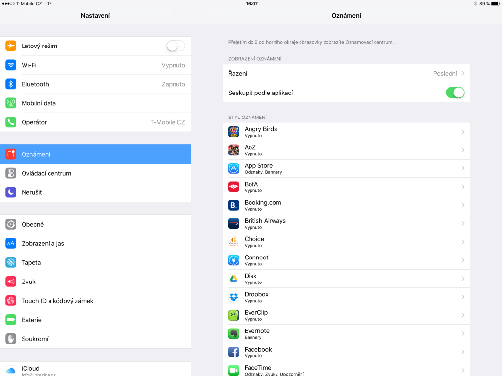 Na iOS je zvykem, že skoro všechny aplikace se dožadují možnosti zasílat push notifikace. Dost často se mi stává, že notifikace nezakážu, protože mám pocit, že se budou hodit. Výsledkem pak je, že jste soustavně vyrušování od práce a navíc se zkracuje výdrž na baterii, protože i když iPad nepoužíváte, displej se na pár sekund rosvítí, aby vás informoval o příchodu notifikace. Takže jsem si otevřel Nastavení – Oznámení a nemilosrdně většinu z nich vypnul. Zejména sociální sítě jsou doslova morem pro efektivitu a soustředění.