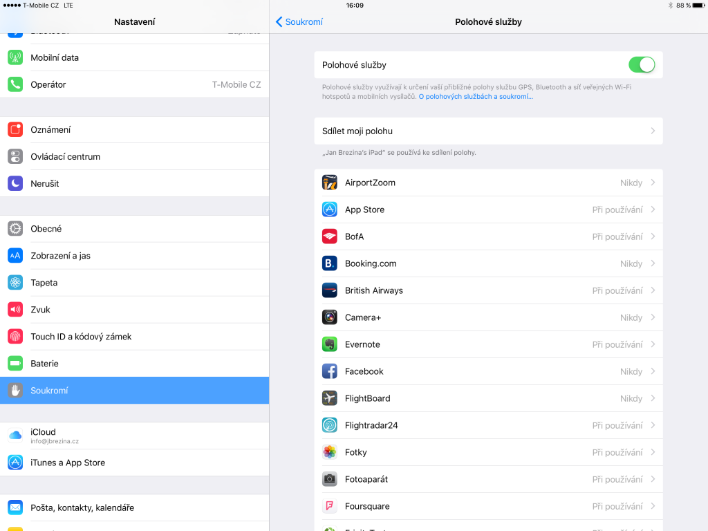 Tato rada se týká výdrže akumulátoru a samozřejmě vašeho soukromí. I zde platí, že používání GPS je velmi rozšířené i mezi aplikacemi, které zdánlivě vaší polohu nepotřebují nebo se bez ní obejdete. Moje zkušenost je taková, že ušetříte až hodinu výdrže denně. Moderní aplikace pro iOS 9 mají navíc volby 3 – Nikdy / Pouze při používání / Vždy, takže prostřední volbou můžete šetřit energii a nepřijít o polohové služby, když aplikaci aktivně používáte.
