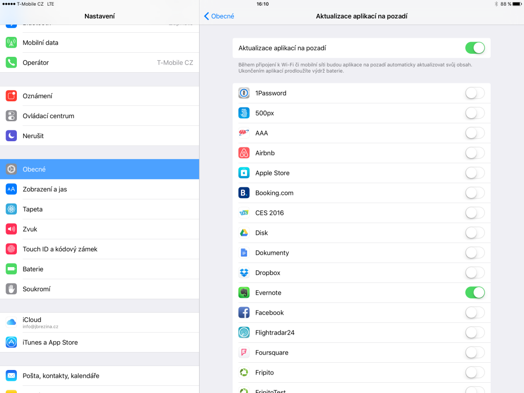 Pokud aplikaci zakážete aktualizaci na pozadí, tak jednak získáte větší kontrolu nad přenášenými daty, druhak opět zvýšíte výdrž baterie. Je sice pohodlné spustit appku a mít všechno již stažené a aktuální, ale osobně většinu aplikací používám nárazově a tudíž je pro mě výhodnější skoro všude tuto volbu povypínat. najdete ji v Nastavení – Obecné – Aktualizace aplikací na pozadí.