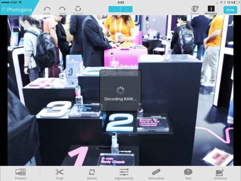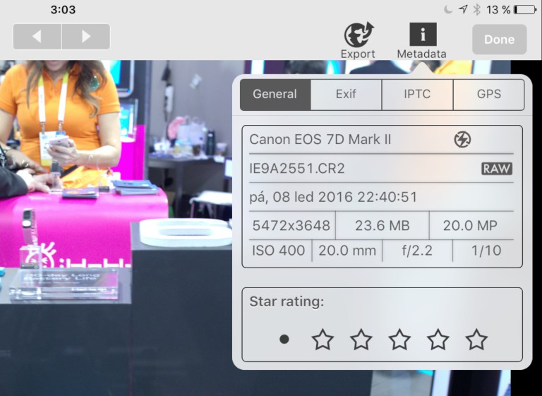 První dobrá zpráva je, že Photogene4 zobrazuje velice rychle, pohodlně a přes celou obrazovku náhledy jednotlivých složek/alb/fotografií ze systémové knihovny. Znamená to, že nemusíte importovat/duplikovat zdrojová data pro jejich zpracování. Při otevírání souboru aplikace zahlásí v případě RAW souboru „Decoding RAW“, takže pokud fotografujete RAW+JPEG, tak víte, zda pracujete s RAW či s JPEGem. Zároveň si můžete nechat zobrazit metadata, kde vidíte formát, rozlišení i informace z EXIFu. Potěší i možnost označovat fotografie 0 – 5 hvězdičkami, což aplikace Fotky nepochopitelně neumí 🙂