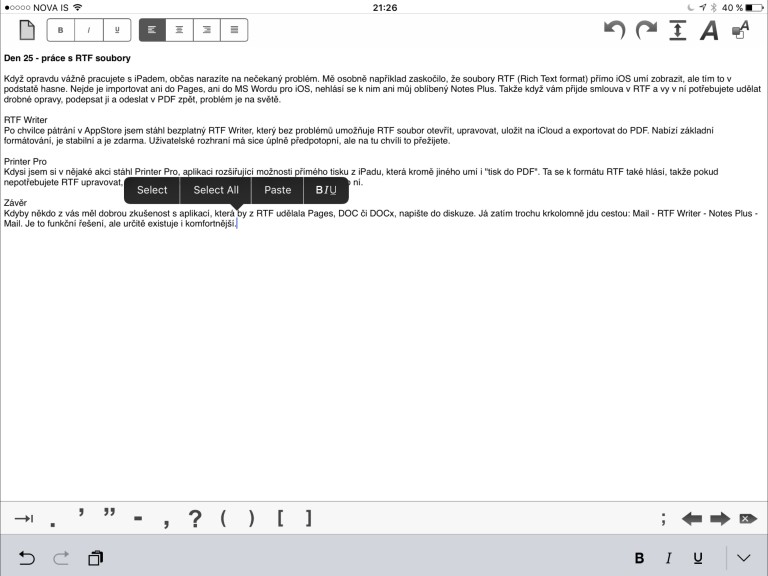 Když opravdu vážně pracujete s iPadem, občas narazíte na nečekaný problém. Mně osobně například trochu překvapilo, že soubory s koncovkou RTF (Rich Text format) přímo iOS umí zobrazit, ale tím to v podstatě hasne. Nejde je importovat ani do Pages, ani do MS Wordu pro iOS, nehlásí se k nim ani můj oblíbený Notes Plus. Takže když vám přijde smlouva v RTF, a vy v ní potřebujete udělat drobné opravy, podepsat ji a odeslat v PDF zpět, problém je na světě.