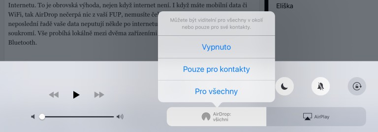 Na iOS zařízení stačí vytáhnout od spodní hrany displeje ovládací panel a vybrat, pro koho bude dostupný. Buď je vaše zařízení viditelné pro všechny s tím, že každý jednotlivý přenos potvrzujete. Nebo pouze pro uživatele, jejichž AppleID máte uložené jako email v kontaktech, a nebo jej vypnete. Pokud je iPhone/iPad zamčený, nejde na nej nic odeslat. Pokud je odemčený, tak je připravený. Aby AirDrop fungoval, musí být také zapnuté BT a WiFi, ale nemusíte být připojení ke konkrétní WiFi síti, protože přenos probíhá napřímo. Pozor, AirDrop je podporován až od iPhonu 5, iPadu 4.generace či mini a iPodu Touch 5.generace.