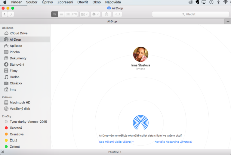 Ma Macu můžete také využít sdílení z aplikací, které to podporují. Jde v podstatě o všechny aplikace od Applu a řada vývojářů sdílení nabízí. Pokud ne, nevadí. Ve Finderu si otevřete AirDrop, zobrazí se dostupná zařízení a prostým přetažením souboru na ikonu zařízení dojde k odeslání.