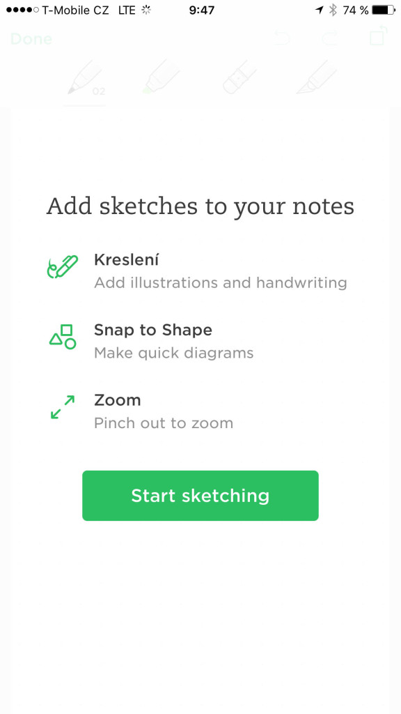 Další novinkou, která potěší zejména paranoidní uživatele, je možnost přihlášení se do aplikace pomocí 1Password. Osobně si vystačím s TouchID, ale může se hodit. Naopak možnost snadného kreslení diagramů díky rozpoznávání geometrických tvarů je super příjemná věc. Dlouho ji používám v Paper a teď už je i přímo v Evernote.