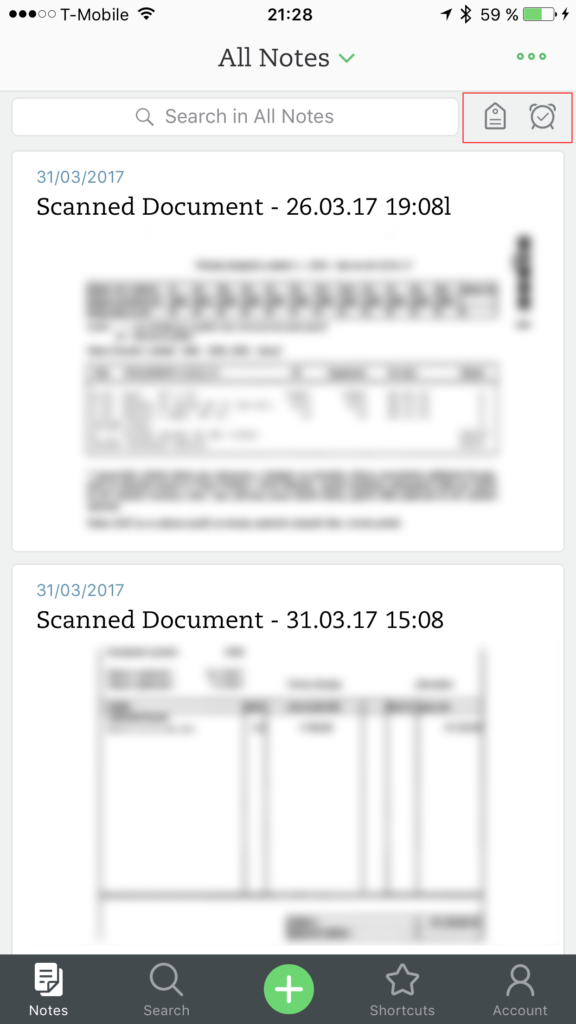 Poslední verze Evernote pro iOS konečně přišla s řešením. Stačí si vybrat seznam všech připomínek a zatáhnout dolů. Objeví se nejen obligátní vyhledávací okno, ale vedle něj i ikony budíčku a štítků. Pak už jen stačí tapnout na příslušný symbol a hotovo.