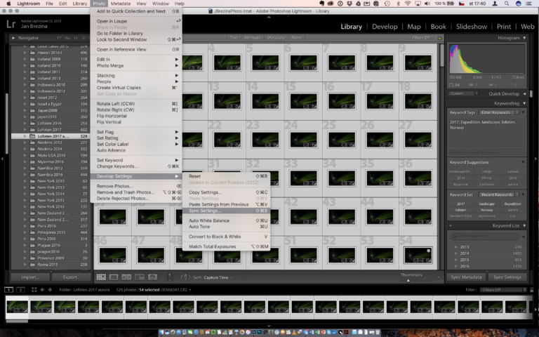 Pokud jste v modulu Knihovna (Library), tak v menu zvolíte Fotografie – Nastavení vyvolání – Synchronizovat nastavení (Photo – Develop setting – Sync Setting). Nebo můžete použít Shift + CMD + S.