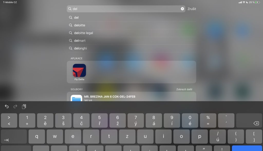 Pokud potřebuji aplikaci, která není na úvodní obrazovce, tak se jí nesnažím najít procházením dalších screenů. Prostě jen na úvodní obrazovce zatáhnu uprostřed displeje dolu, objeví se vyhledávání, já napíšu první 3 až 4 písmena ze jména aplikace a mám ji přímo před sebou. Vyhledávání pomocí Spotlightu je mnohem rychlejší, než procházení obrazovek.