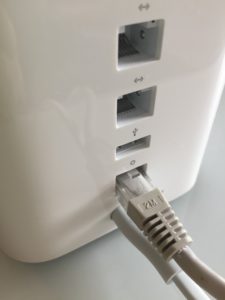 Zapojení je snadné. Do konektoru označeného kroužkem připojíte kabel, který zapojíte na druhé straně do své stávající počítačové sítě, do modemu, či jiného prvku zapojeného do internetu. V mém případě do routeru od UPC. Následně zapojíte zařízení do zásuvky a počkáte až nastartuje. To poznáte podle oranžově blikající diody, která oznamuje, že je potřeba provést nastavení.