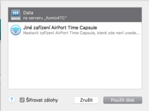 Velkým vypínačem zapnete zálohování a vyberete si zálohovací disk. Systém vám automaticky nabídne disk Time Capsule, který se standardně jmenuje Data.