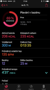 Na konci plavání hodinky zobrazí statistiku. Tak kromě jiného ukazuje i rozpoznaný plavecký styl. Všechny informace se samozřejmě synchronizují do Aktivit do iPhonu.