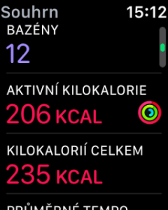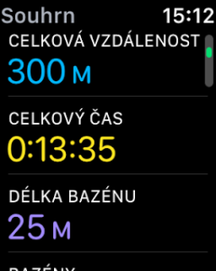 Na konci plavání hodinky zobrazí statistiku. Tak kromě jiného ukazuje i rozpoznaný plavecký styl. Všechny informace se samozřejmě synchronizují do Aktivit do iPhonu.