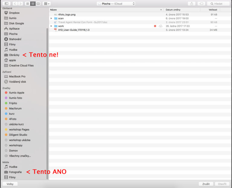 V jakékoli aplikaci na Macu, když dáte Otevřít soubor, Importovat, Vložit apod. se otevře standardní systémové okno, která vám zobrazí právě Finder. Místo abyste šli do své domovské složky, do podsložky Obrázky a snažili se otevřít knihovnu fotografií, všimněte si zcela dole sekce Média. V té je přímý přístup do knihoven Filmů (iMovie), Fotografií (Fotky, iPhoto či Aperture) a Hudby (iTunes).