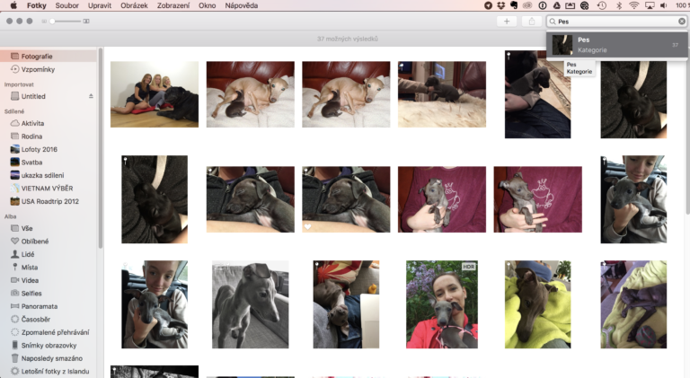 Spustíte aplikaci Fotky, která je k dispozici jak na iOS, tak i na Macu. Ať už stojíte ve Fotografiích, Albech či Vzpomínkách, vždy je k dispozici lupa pro vyhledávání. Stačí ji vybrat a napsat, co hledáte. Kromě rozpoznávání obličejů, práce s GPS či klíčovými slovy se využívá právě databáze rozpoznaných objektů uvnitř fotografií. Takže můžete vyhledávat místa podle jejich názvů, například “Chorvatsko”, “Národní divadlo” nebo třeba “Evropa”. Hledat ale můžete i obecné objekty jako “interiér”, “moře”, “hory”, “pes”, “auto”, “letadlo” apod.