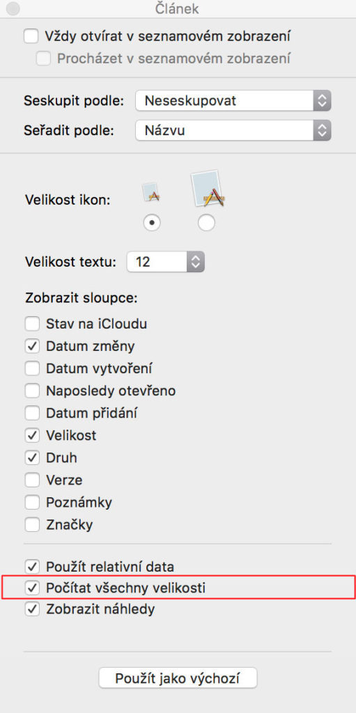 Spusťte Finder a v menu si vyberte položku Zobrazení – Volby zobrazení nebo použijte klávesovou zkratku CMD+J. V zobrazeném okně dole najdete položku Počítat všechny velikosti, kterou aktivujete a tím řeknete Finderu, že chcete vypočítávat i velikosti složek. Pak už jen stačí kliknout na tlačítko Použít jako výchozí, čímž si zapnete toto nastavení pro všechny složky v počítači.