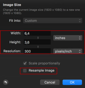 Pokud vypnete Resample image, tak se fotografie nijak nemění a celý dialog funguje jako kalkulačka, která ukazuje potenciální tiskovou velikost při zadaném DPI a zachování počtu bodů.