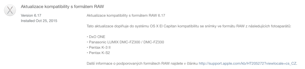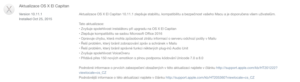 První novinkou je první servisní balíček pro El Capitana, který je logicky zaměřen zejména na opravy chyb. První novinkou je vylepšení samotného instalačního procesu. Někteří uživatelé, i z ČR zaznamenali problémy při čisté instalaci systému, které by již neměli být aktuální. My jsme u všech počítačů provedli aktualizaci systému a vše proběhlo zcela v pohodě.