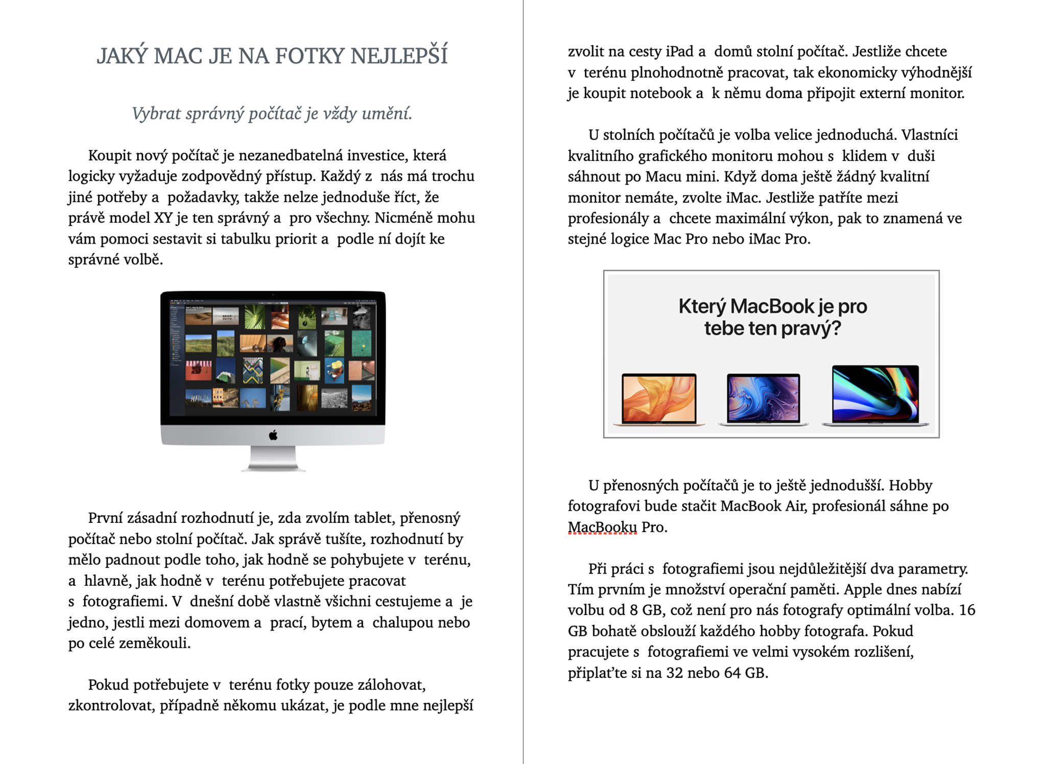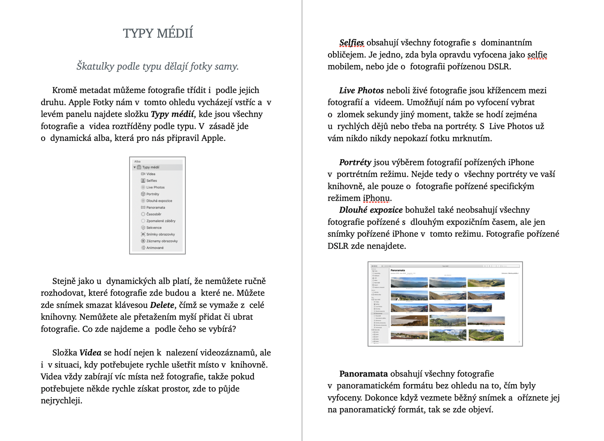 Moji eknihu Jak na Apple Fotky si můžete stáhnout ve dvou formátech. První možností je ePUB, který se skvěle čte například v aplikaci Knihy od Applu. Pokud máte oblíbenou jinou čtečku, ePUB do ní pravděpodobně půjde načíst také. Výhodou ePUB formátu je takzvaná plovoucí sazba. Při čtení můžete měnit písmo, velikost písma, barvu pozadí tak, aby se vám dobře četlo.