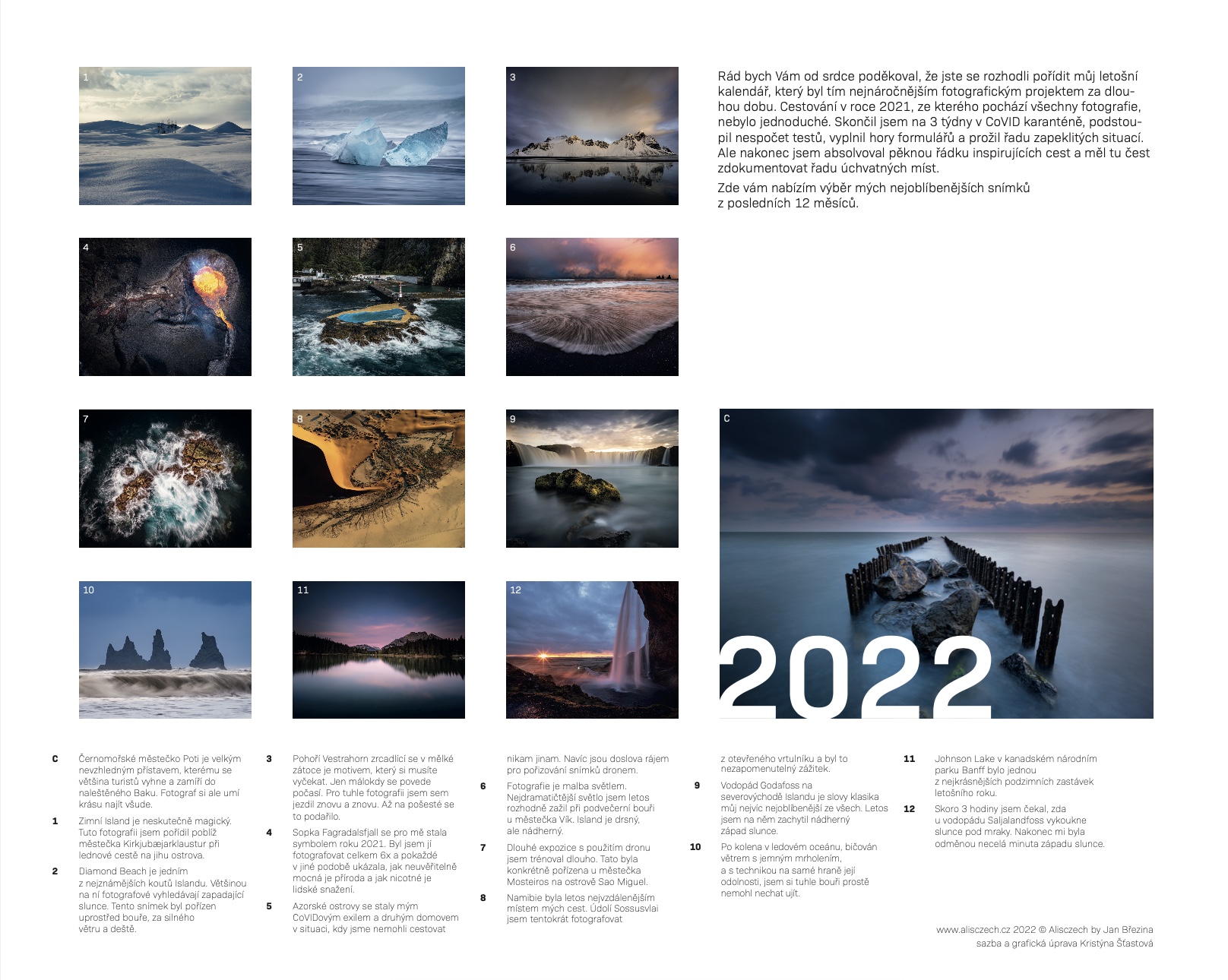 Letošní rok byl pro mě, jakožto fotografa – cestovatele velice náročný. Na rozdíl od loňska již bylo možné cestovat do vybraných destinací, ale cestování bylo extrémně organizačně náročné. Přesto jsem při prvním výběru došel k překvapivě vysokému počtu kandidátů. Postupně jsem ze 63 snímků prvního výběru redukoval a skládal příběh letošního roku. V kalendáři najdete snímky z Islandu, Azorských ostrovů, Gruzie, Kanady a Namíbie.