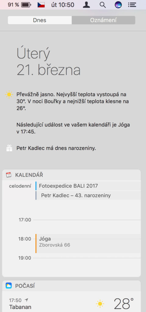 Stejně jako na iPhonu, i Mac OS obsahuje oznamovací centrum, ve kterém se soustřeďují zprávy od jednotlivých aplikací. Vyvolat jej můžete buď přejetím dvěma prsty přes pravý okraj Trackpadu nebo pomocí ikony v pravém horním rohu displeje Macu.