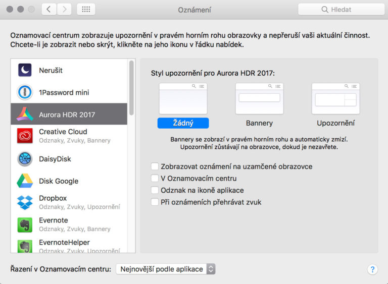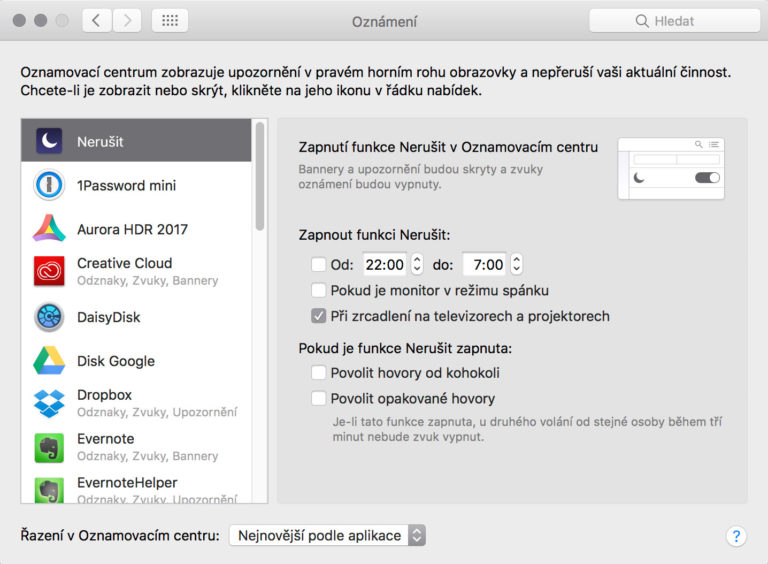 Pořadí oznámení v Oznamovacím centru můžete změnit v dolní části okna s nastavením Oznámení. Osobně mi více vyhovuje varianta Nejnovější podle aplikací.